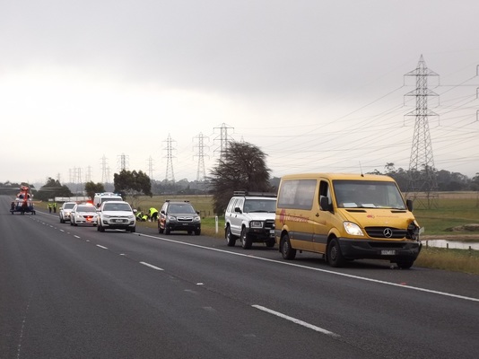 Several police cars and ambulance at the scene of the crash before the rider was airlifted to hospital. 150736 Picture: RON LIMBRICK