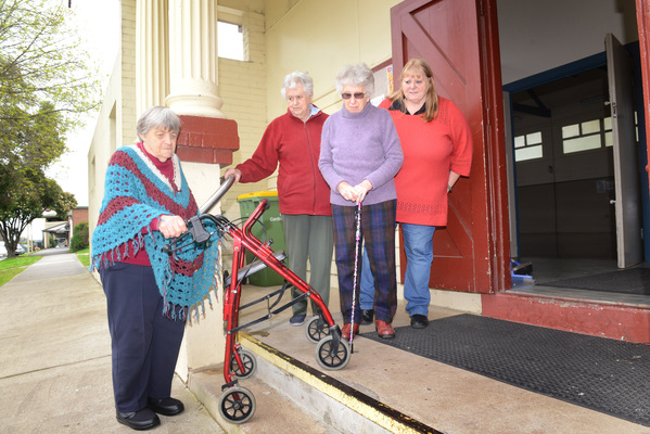 Mary Hansen, Dorothy Myers, Shirley Koschade and Chris Kelly demonstrate how the steps from the road to the footpath and to the front entrance are a problem for walking frames and wheelchairs. 158758_04 Picture: ROB CAREW