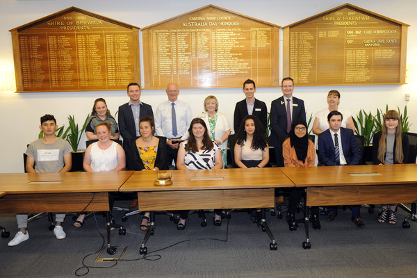 Pictured with Cardinia Shire Council members are the 2018 Youth Council members Mehdi Ahmadi, Emily Bloxidge, Kiara Ventura, Jennifer James, Prachi Beniwal, Hajar El-Hennawi, Joe Barratt, Amy Gregorovich. Absent for the photo was Kurt Caddy. 176307 Picture: STEWART CHAMBERS
