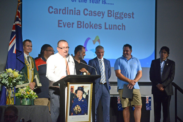 Cardinia Casey Biggest Ever Blokes Lunch committee chairman and Star News Group South East Division Group Editor Garry Howe accepts the award for Community Event of the Year. 176994 Picture: ROB CAREW
