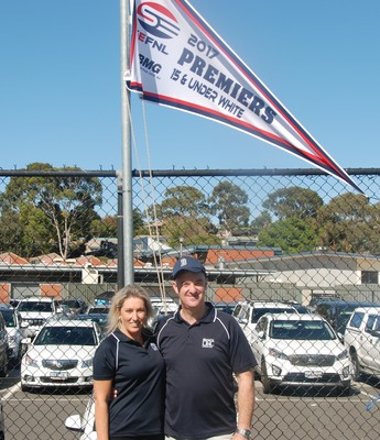 Berwick Netball Treasurer David Green (right) and Mel Guic proudly show off the 15 & Under White premiership flag. 179705 Picture: NICK CREELY