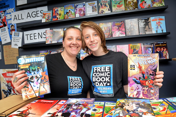 Kristy Litkowski and her son Toby with free comics. 180519_01 Pictures: ROB CAREW