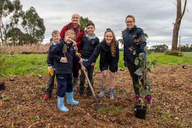 Planting trees at Chairo, from left, Preps Joshua and Leila, Lydia Tweedie - Head of Junior School, Junior School captains Joel and Layla and Chairo's program coordinator Fiona Driehuyzen. Picture: SUPPLIED
