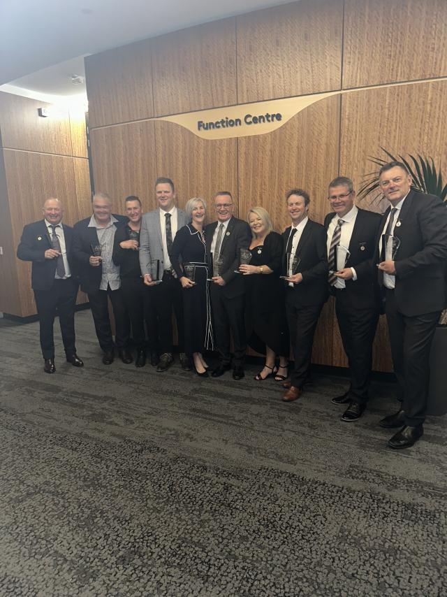 Narre Warren Football Netball Club's 2024 Hall of Fame inductees (L to R) Brad Alexander, Chris Toner, Dean Mashado, Michael Collins, Janette McGill, Kim McGill, Michelle Mashado, Hayden James, Stuart Stephenson and Darren Dwyer. (Supplied)