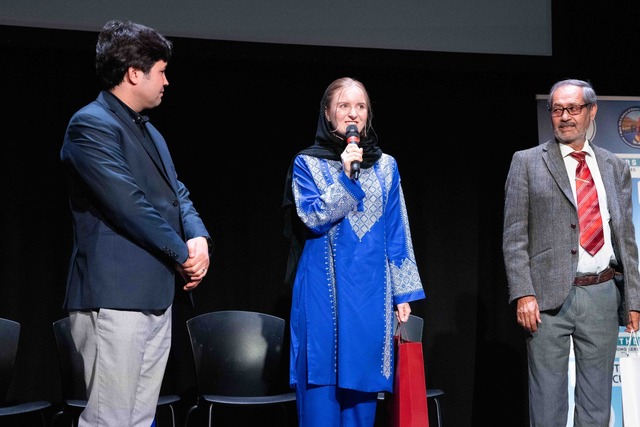 President of the Hazara Cultural Association Barat Batoor together with guest speakers Grace Sultani and Mohammed J Gulzari. (Jan Shafaie)