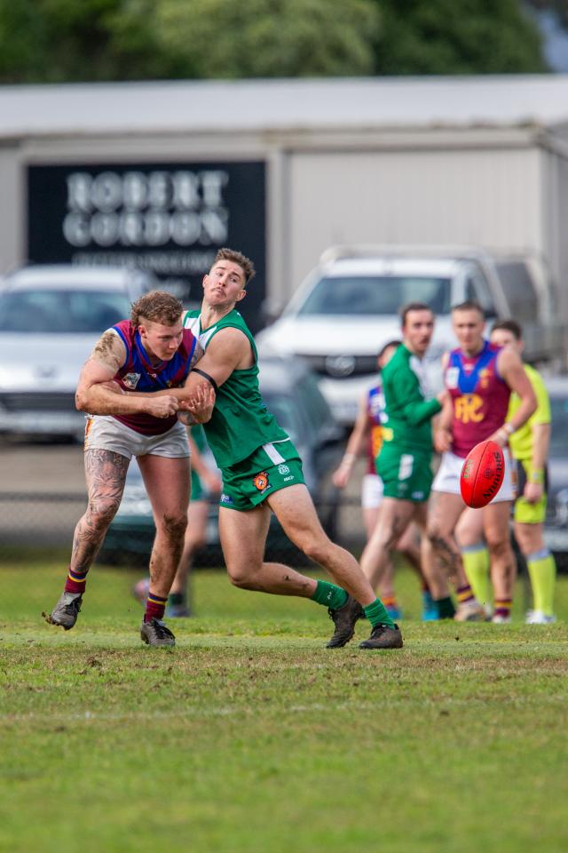 Pakenham's Rhys Clacy (tackled) was excellent in the engine room on Saturday. 353285 Picture: GARY SISSONS