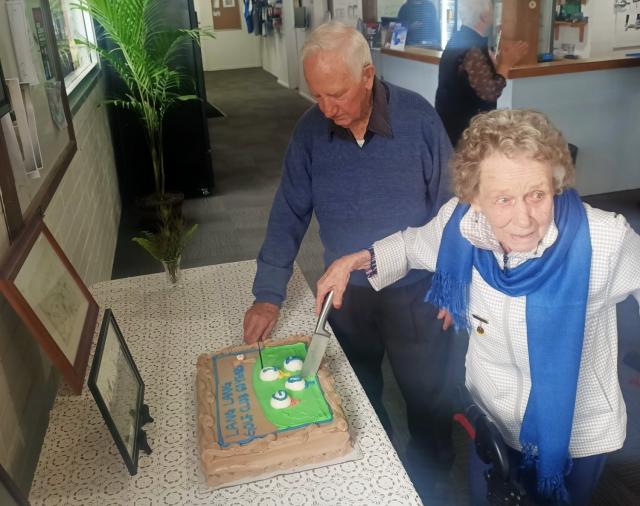 Life members Harry Maxwell and Margaret McDonald cut Lang Lang Golf Club’s 60th birthday cake. 368522 Picture: SUPPLIED