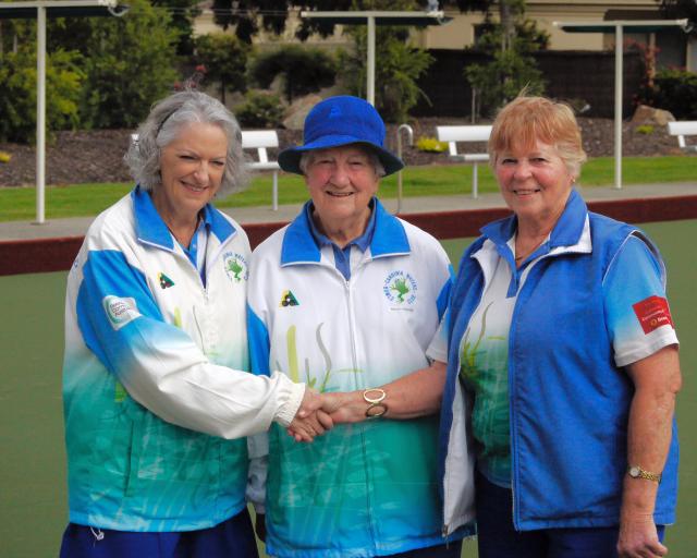 Shaking hands before their Championship Final on Friday are Michele Bondfield (left) and Marie Stephenson (right). In the centre is their marker, Marion Stevens. 384572 Pictures: SUPPLIED