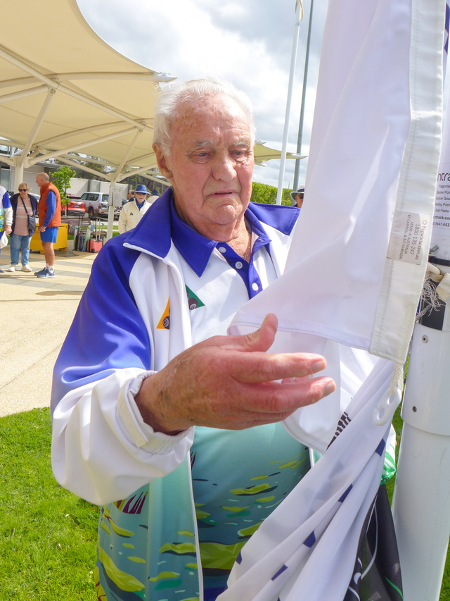 John Cleland unfurls the Cardinia Waters Bowls Club flag on season opening day. (Supplied: 508325)