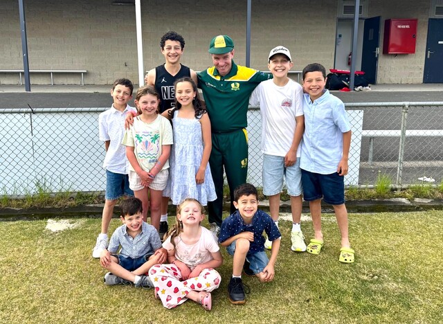 Officer star James Quinn celebrates his 600th wicket with his appreciative nieces and nephews. (Supplied: 518337)